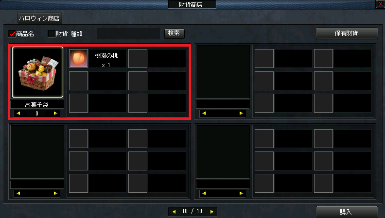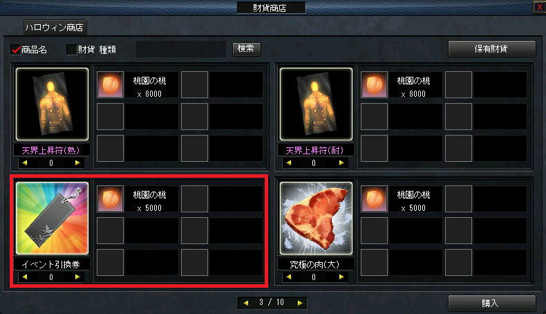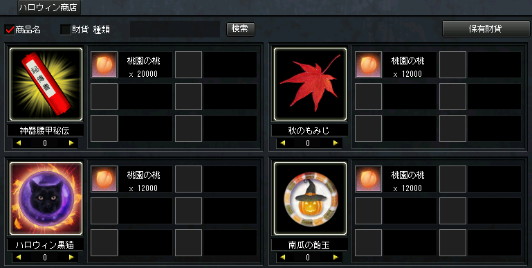 イベントNPC「ハロウィン天女」が出現します。 集めた「桃園の桃」は[ハロウィン商店]コマンドで 各種アイテムと交換しよう! ![]()